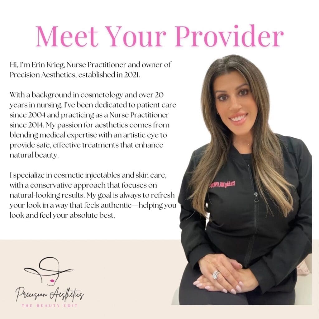 EXCELLENT Based on 42 reviews Posted on Toni MorelandTrustindex verifies that the original source of the review is Google. Erin was so helpful and explained everything to me. Highly recommend!Posted on michaela AndersonTrustindex verifies that the original source of the review is Google. First time getting Botox for my jaw and tmj relief! Painless and super quick. She’s the absolute best ????Posted on Cheri PorterTrustindex verifies that the original source of the review is Google. Very happy with my results. Almost painless. lolPosted on Shannon HanselmanTrustindex verifies that the original source of the review is Google. Erin was absolutely amazing, she made me feel at ease with this being my first time for any injections. Will definitely be back soon.Posted on Melissa OrlandoTrustindex verifies that the original source of the review is Google. Erin is beyond amazing!! She is extremely skilled and a perfectionist which is exactly what you want in a provider. I got micro needling here which she suggested instead of filers and she was absolutely right! Went back for lip fillers and it was like having an artist give me the perfect lips. She is beautiful, sweet , funny and most importantly a miracle worker for cosmetic procedures .. I’ve been to several other places with not so great results. I will never go to anyone but Erin from now on.Posted on Shauna LeighTrustindex verifies that the original source of the review is Google. I contacted Precision Aesthetics after a friend has posted her list of services on Facebook. I saw that Latisse was one of the products she offered. I called and the owner and CRNP Erin was beyond sweet and accommodating! She only had one box in stock when I wanted two, do she gladly offered to mail me my second box. I also spoke with her about some of the other services she offers, and she was so thorough and recommended different things I could have done. I will be sure be booking my next med spa services with her! Also, the salon is beyond adorable as well! Thank you Erin!Posted on Ashley BakerTrustindex verifies that the original source of the review is Google. This was my first time getting any kind of cosmetic injections. Erin is amazing!! I told her what I wanted to fix and she told me what she thought would work and my results are better than I could’ve imagined. I was very nervous going in but Erin put me right at ease. This was such an amazing, exciting experience and I will continue to come here. I cannot recommend her enough.Posted on Sandra HansenTrustindex verifies that the original source of the review is Google. Had a consult today for a couple issues I’m having. Erin was very easy to talk to and I’m excited about my future treatment with her. Felt very comfortable. Her shop is super cute and clean! Thanks Erin see you soon! She also has ZO products which I use to help my skin and prevent breakouts.Posted on Cynthia MckennaTrustindex verifies that the original source of the review is Google. Erin is the best! She is very knowledgeable about what she does & that puts you at ease. The place is so pretty & clean. I was very happy with my results & will definitely recommend Erin to anyone.Posted on Briana Rasicci-FernandezTrustindex verifies that the original source of the review is Google. Hidden Gem in Weirton! Beautiful space & Erin is a true professional at what she does! Would highly recommend!